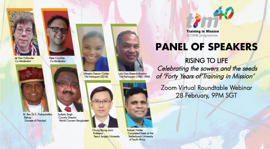 You are invited to join us for this year’s TIM40th Anniversary celebration, with the overarching theme Rising to Life: Celebrating the sowers and the seeds of Forty years of ‘Training in Mission’. For those who missed our first event last November, we are back with another virtual roundtable gathering featuring a new slate of panellists on 28 February, 9:00 PM SGT.