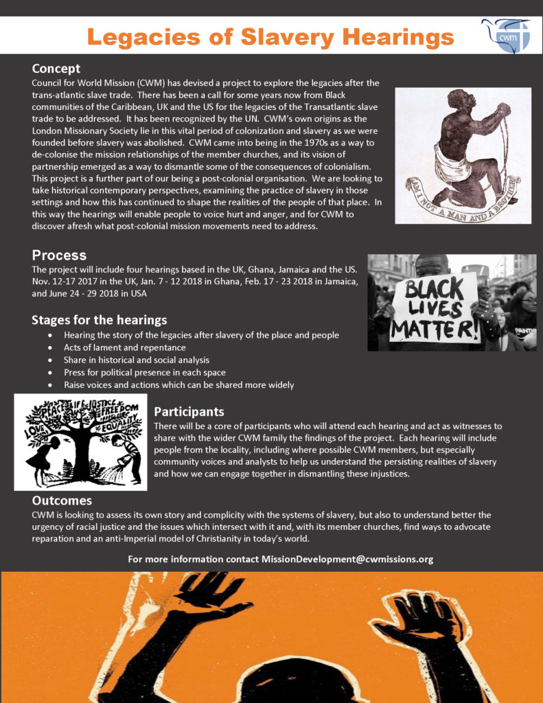 This is my sharing in the context of the Legacies of Slavery Hearings held by CWM (Council of World Mission) in London, Accra, Kingston and the US. I was also invited to attend the hearings in Kingston.